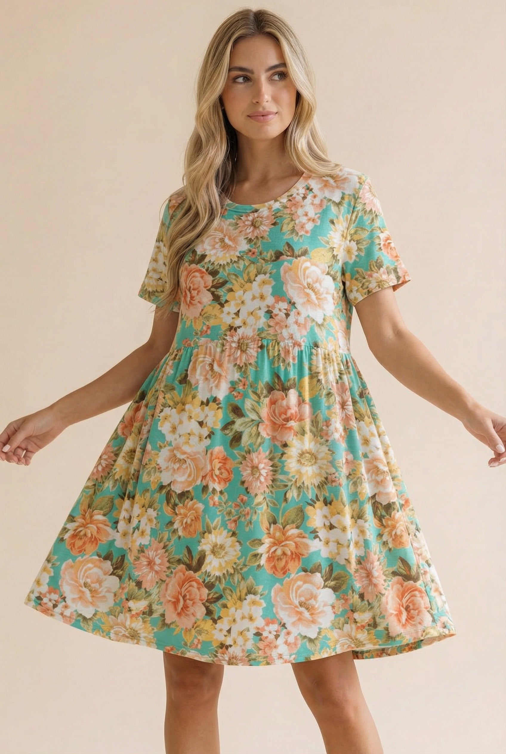 ROUND NECK SHORT SLEEVE BABYDOLL FIT AND FLARE FLORAL PRINT KNEE LENGTH KNIT DRESS WITH SIDE POCKETS